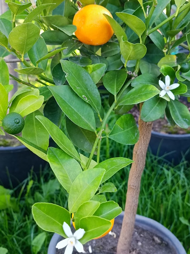 Alacsony törzsre oltott, termőkorú citrusfa.